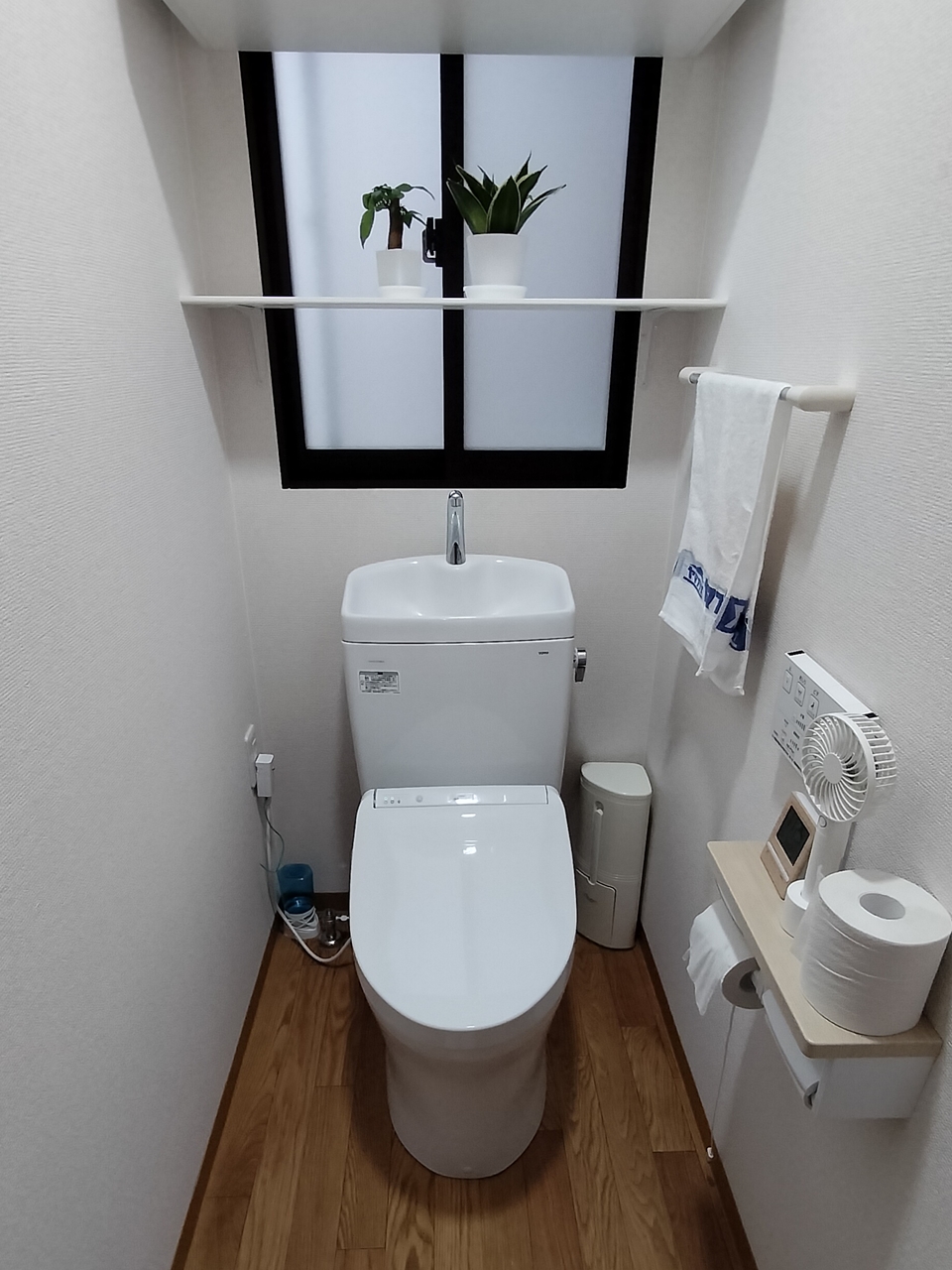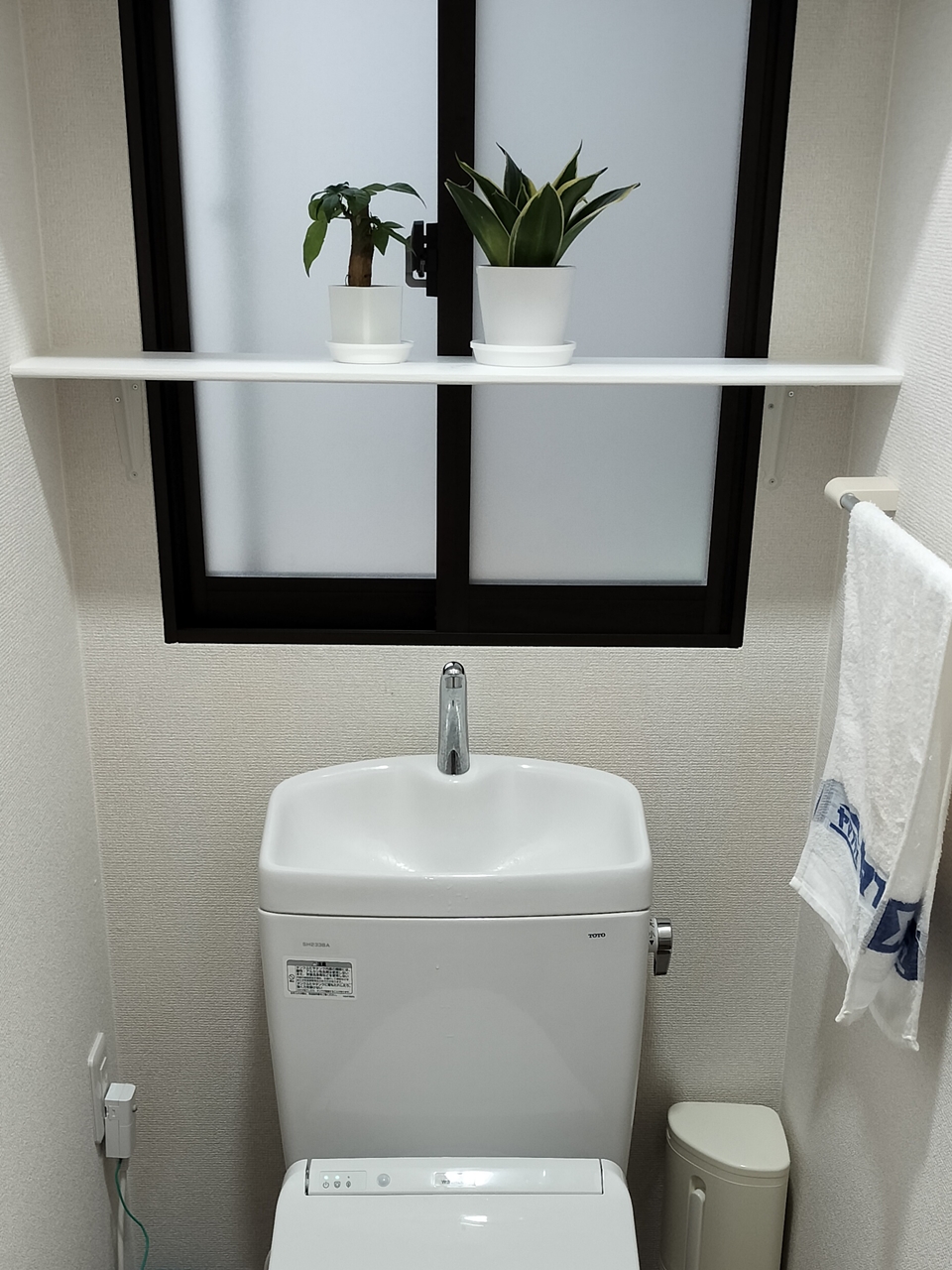2階トイレの窓ガラスが透明なので、なんとなく落ち着かない。という指摘をもとに窓に目隠しガラスフイルムを施工した。ついでに観葉植物を置くための棚も付けた。費用は極力抑えた。