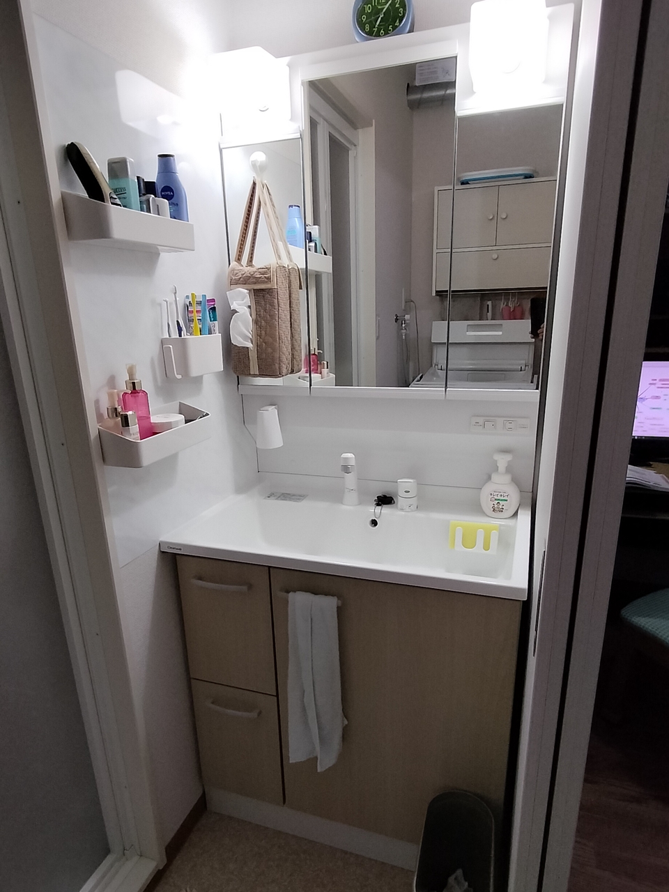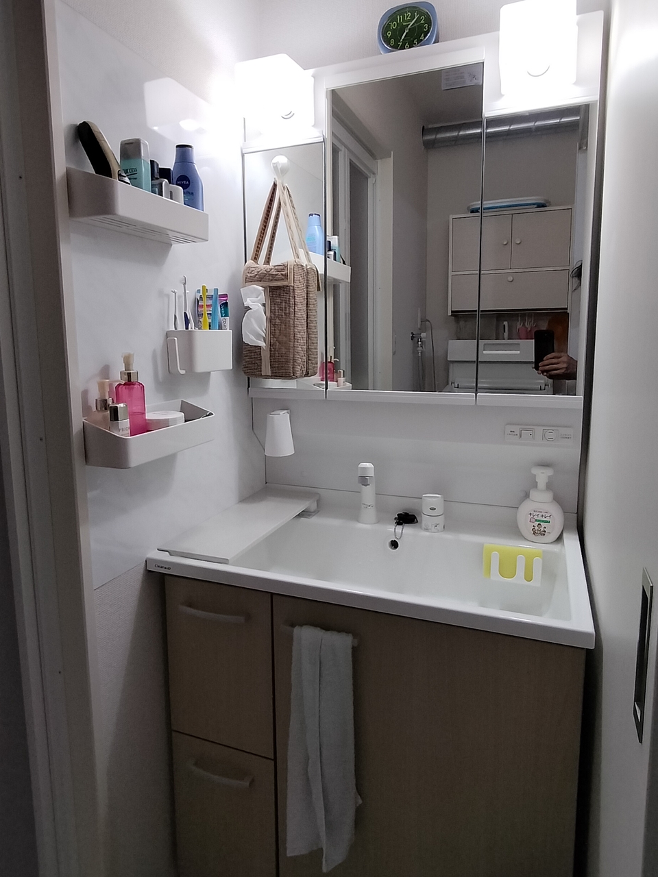 洗面台横にちょっとした物を置きたいということで、サイドプレートをDIYで作成しました。材料はユニットバスの廃材です。見た目もよく水にも強いので重宝しています。